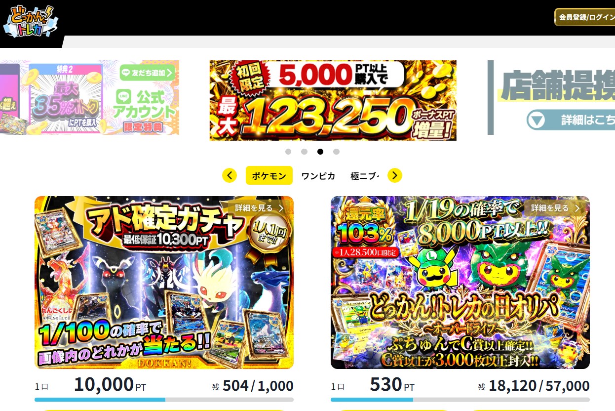 どっかん!トレカは、派手な演出とスピーディーな展開で「引く瞬間のワクワク」を最大限楽しめるオリパサービスです。
